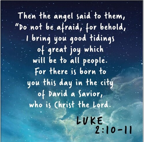 The the angel said to them, "Do not be afraid, for behold, I bring you good tidings of great joy which will be to all people. For there is born to you this day in the city of David a Savior, who is Christ the Lord.